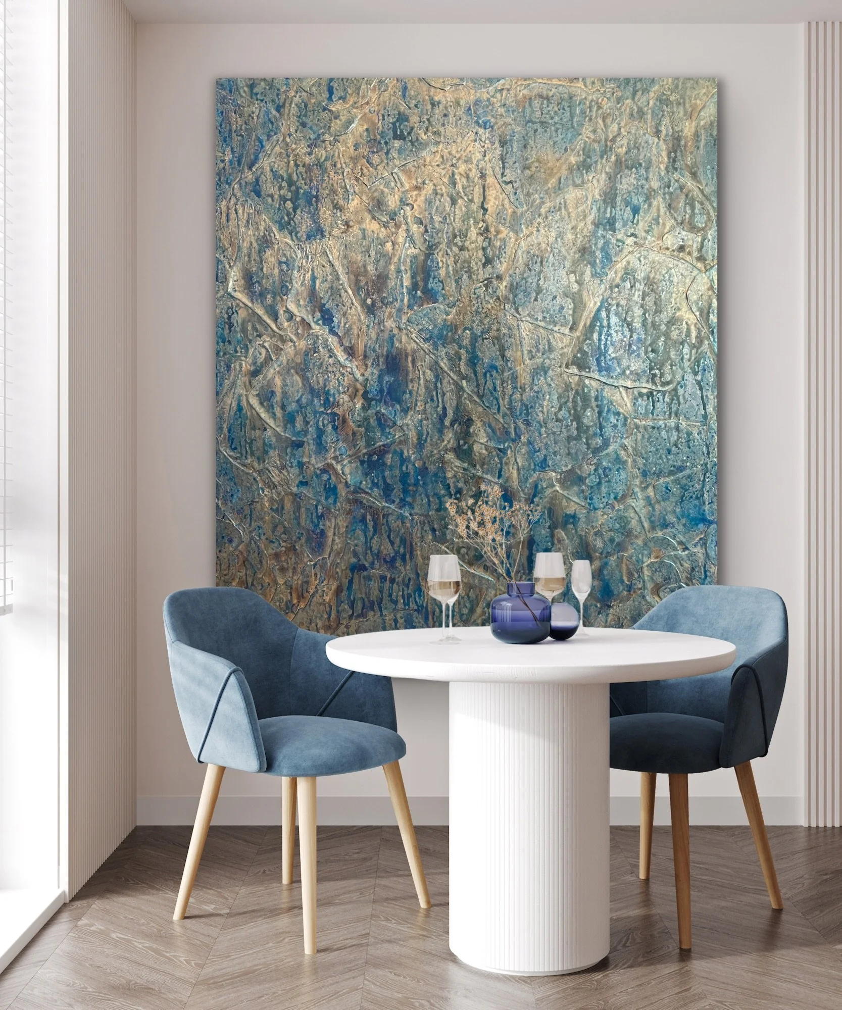 Acrylic, ink, pastel and crushed minerals on highly textured wood panel with a satin archival finish. Black 2.5" profile edge.