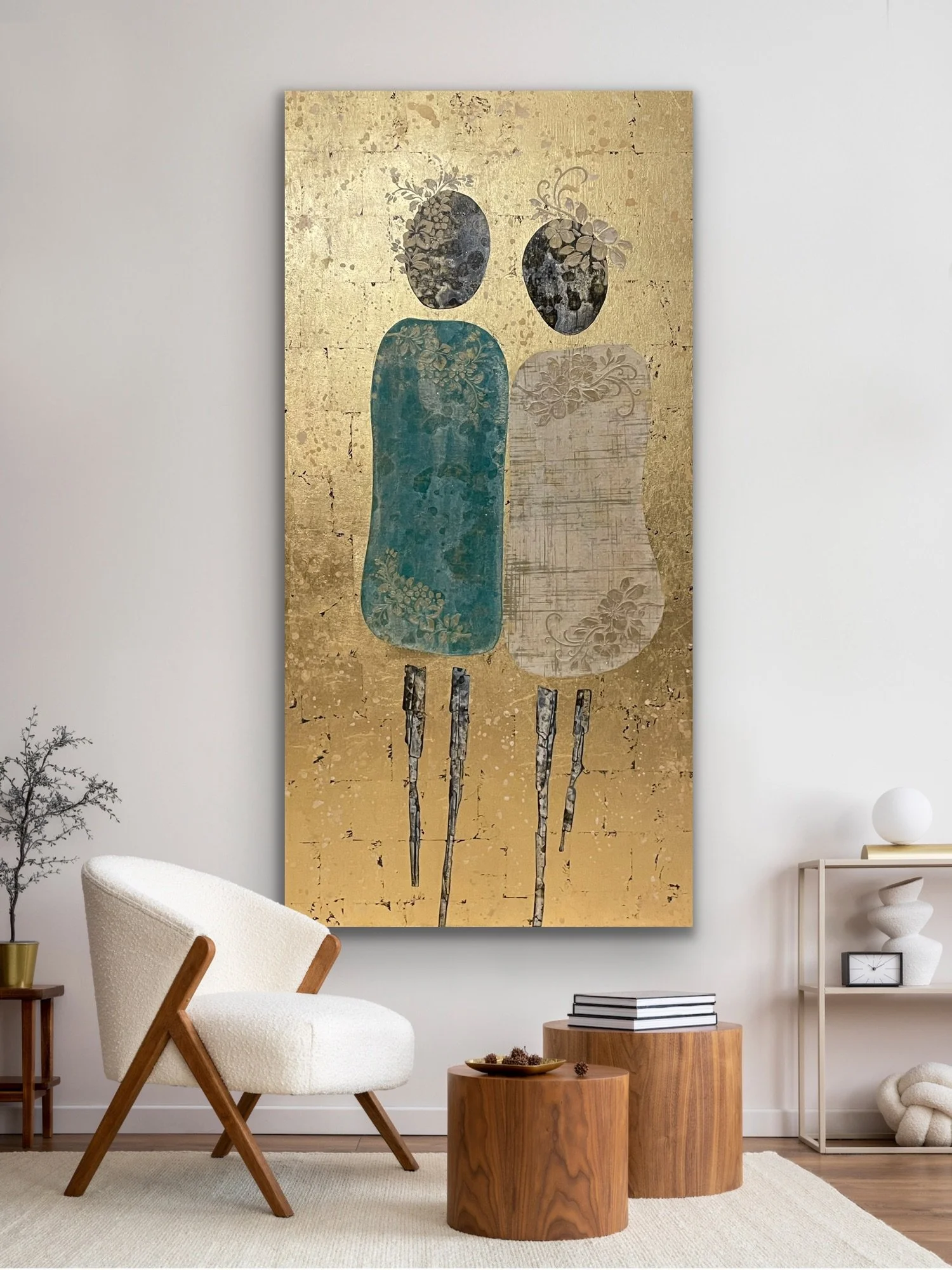 Acrylic, ink, gold leaf and washi papers on gallery wrapped canvas with a satin finish. Black 1.5” profile edge that can be hung in any direction.