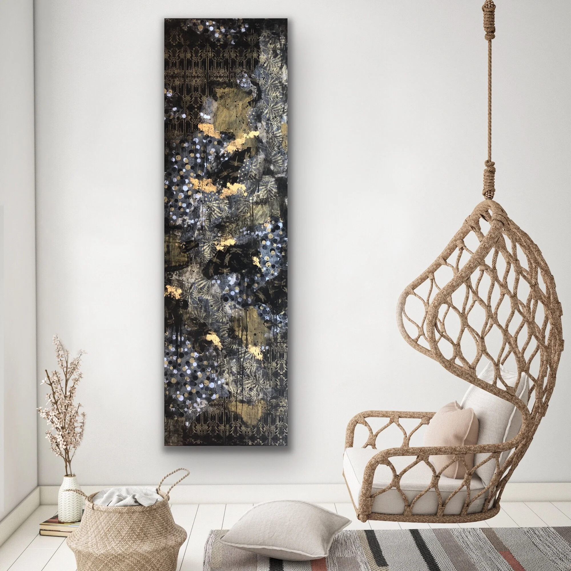 Acrylic, ink, washi paper and 24K gold leaf on a high glossed resined wood panel.  Black 1.5” profile edge.
