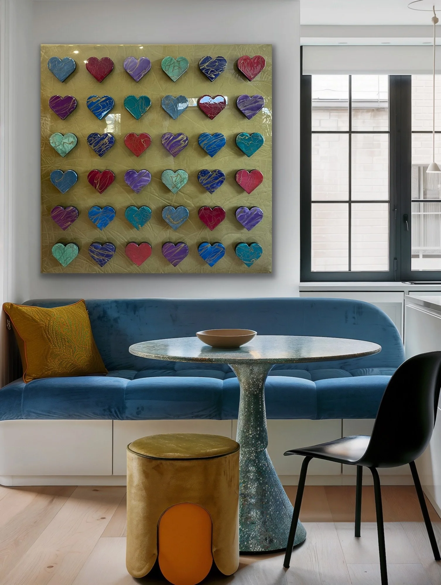 Acrylic, ink, crushed minerals on wood panel with a resin finish and 36 offset hearts. Black 2” profile edge.